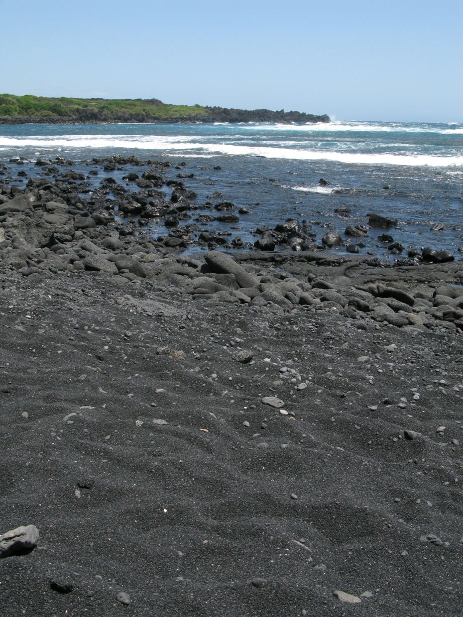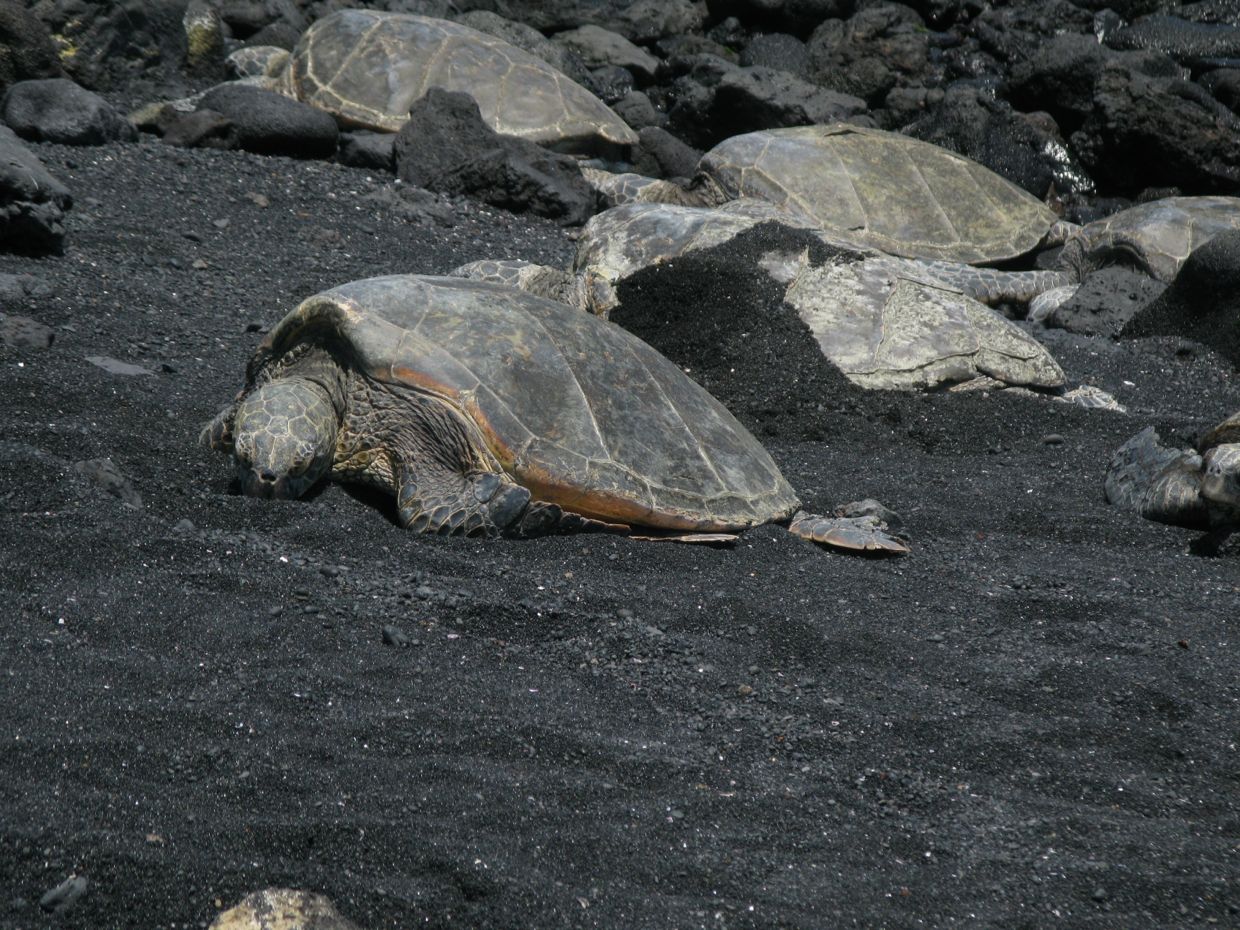 Turtles on black sand beach