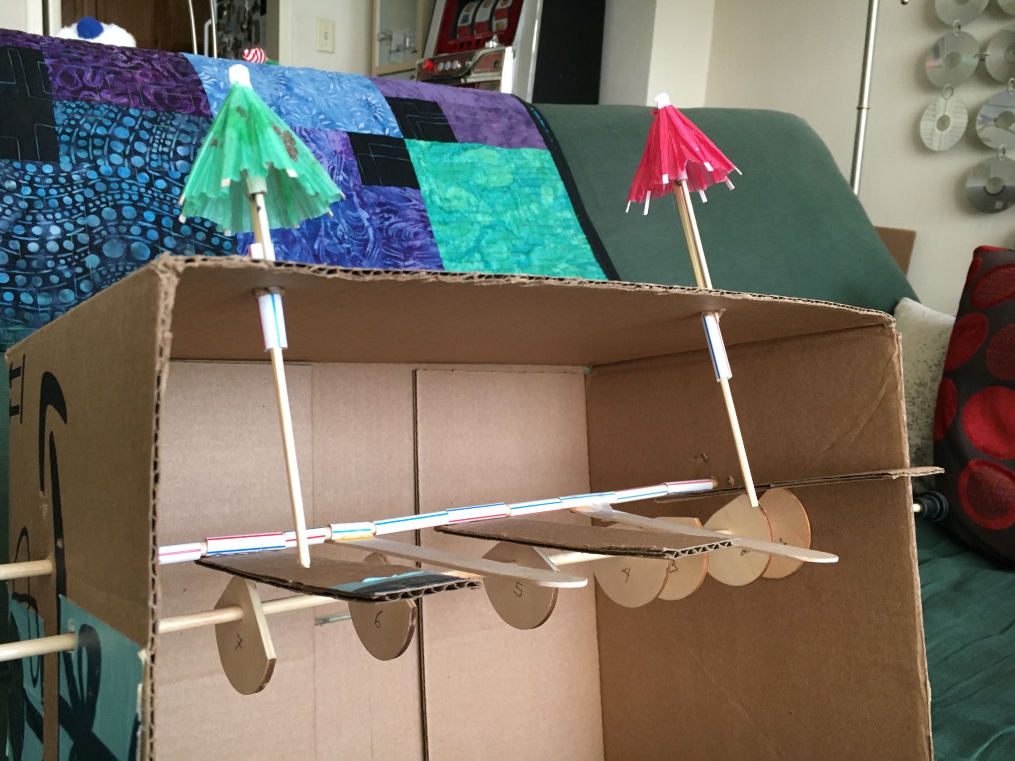 My brother Jim and I sanded down some wooden disks to form the cams that spun on a dowel.