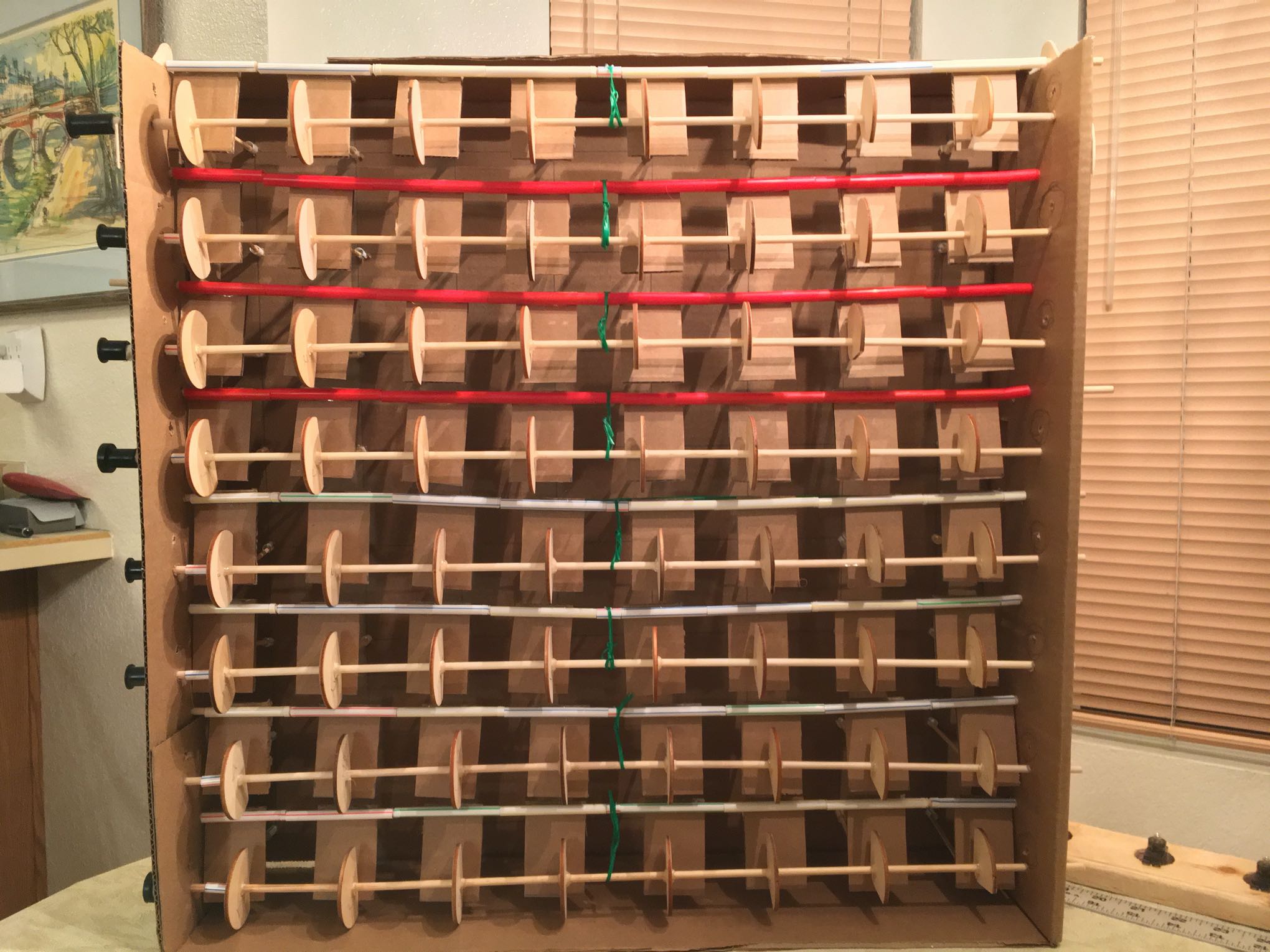 This is the under-side. Plumbing parts I got at Ace Hardware are glued onto the ends of the dowels to connect the servo motors.