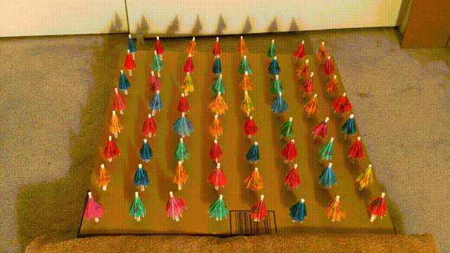 Umbrellas UP! A Raspberry Pi computer controls 8 servo motors that spin the cams to lift the umbrellas.