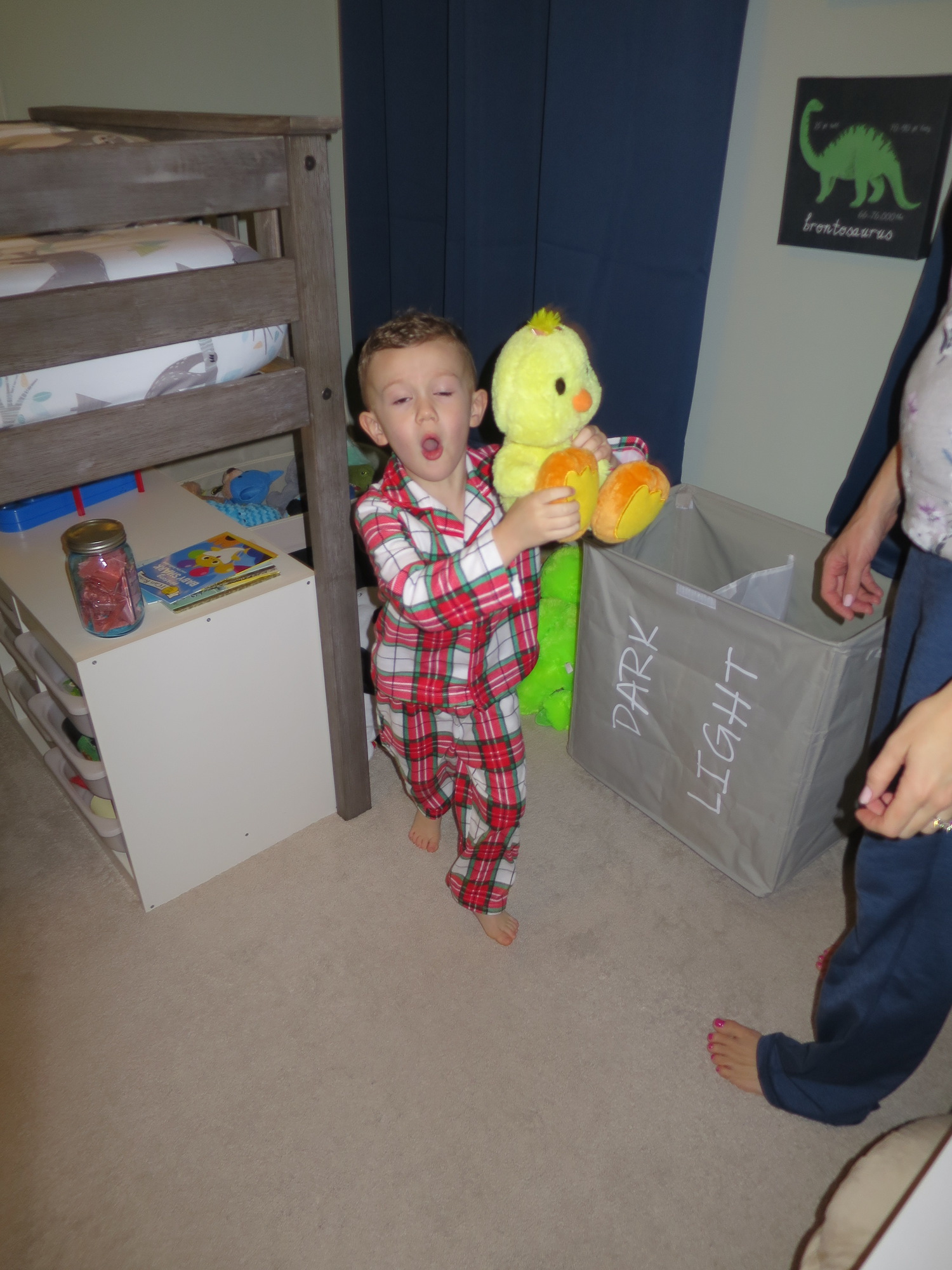 We reviewed his inventory of stuffed animals before bed.