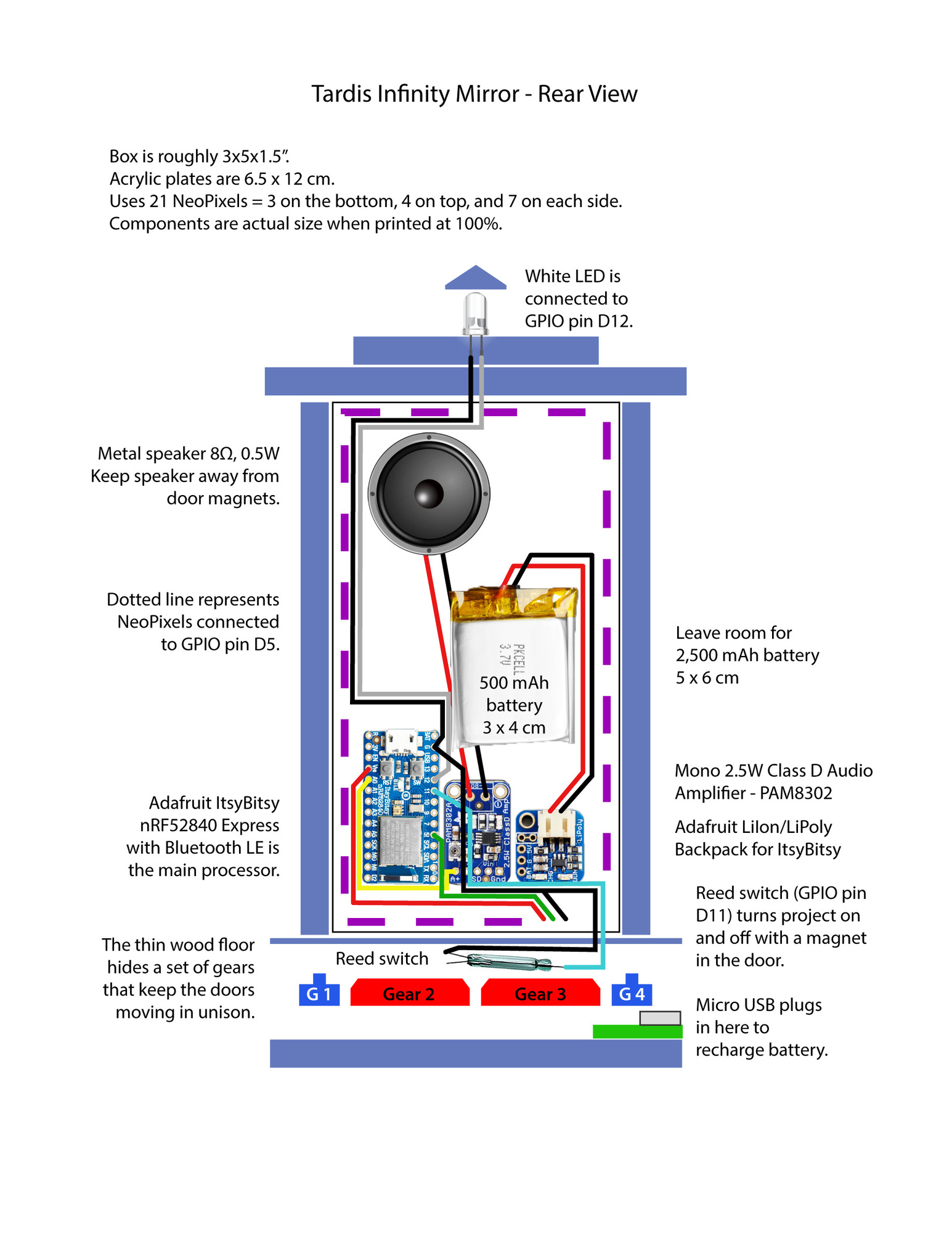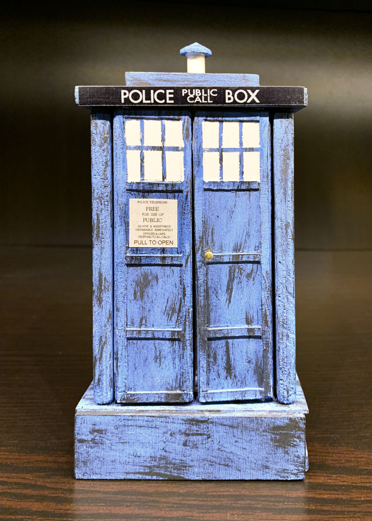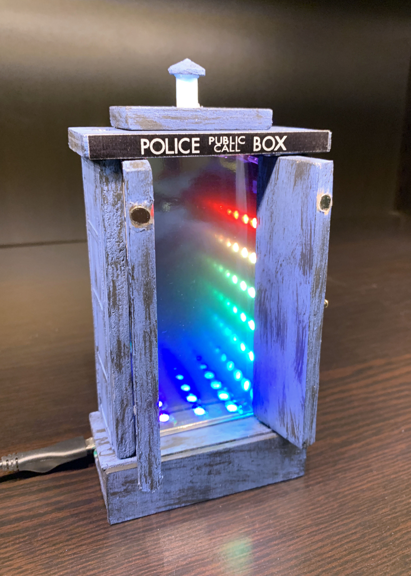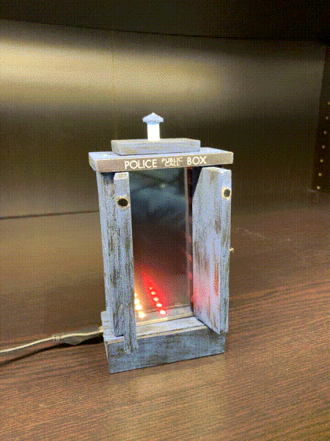 I've set up an infinity mirror to give the illusion that the mini Tardis is "bigger on the inside". A pair of one-way mirrors is set up with NeoPixels sandwiched in between. When the doors are opened, it triggers the light show to make it look like the interior goes on forever. It also plays the Doctor Who theme from the show.