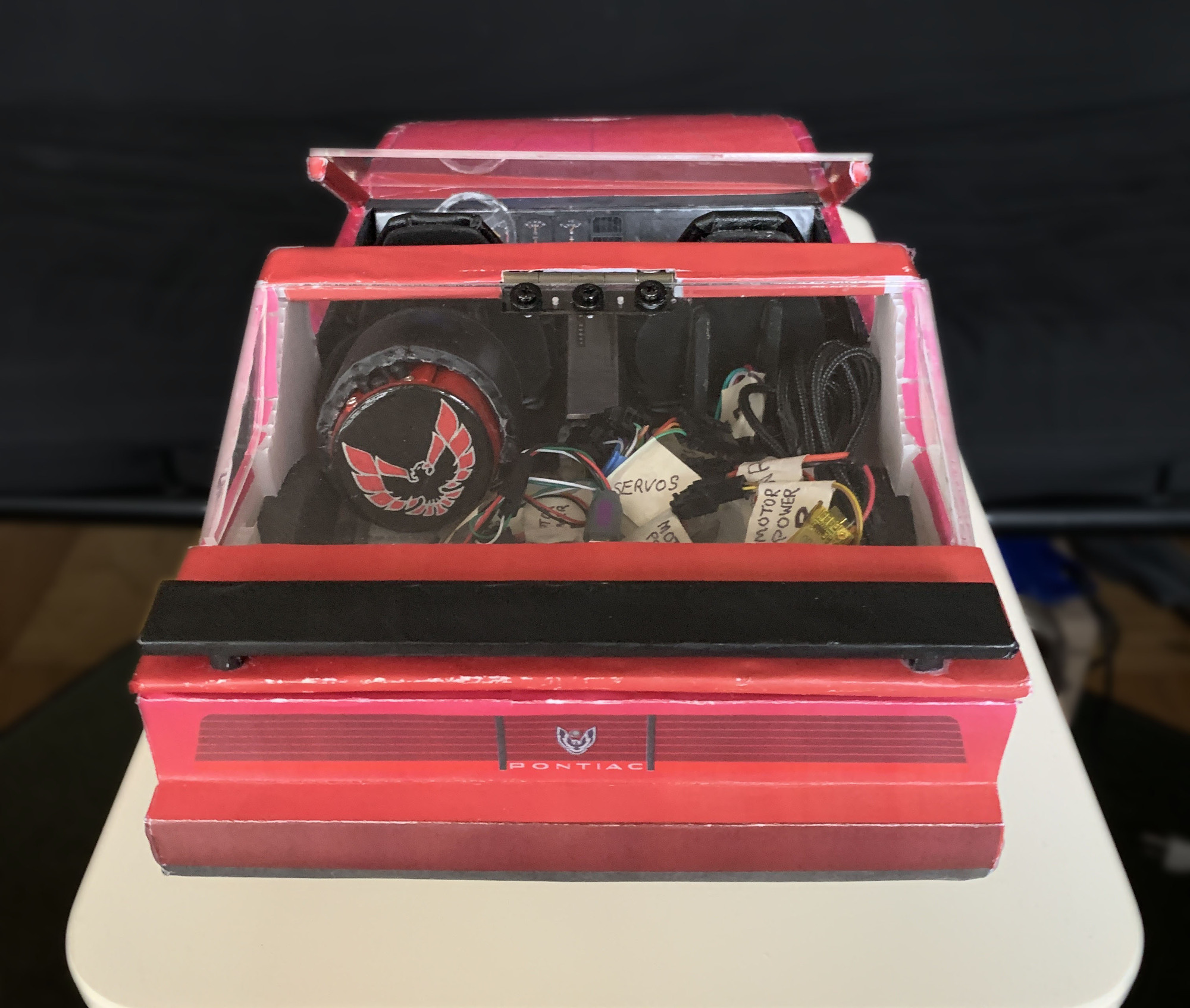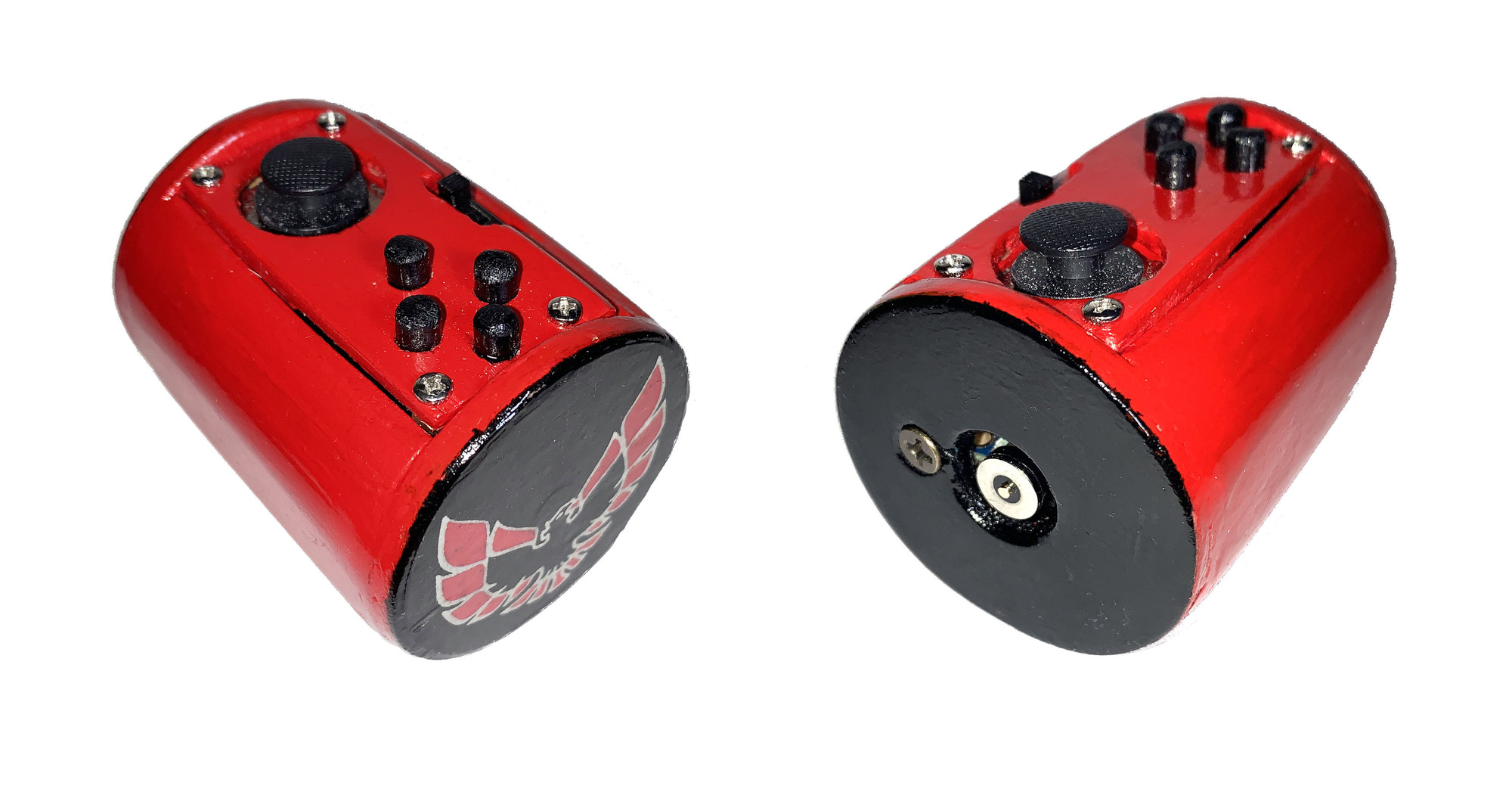 The wireless remote is a simple joystick with a few buttons. The endcap is meant to resemble the emblems Patti and I took off our 1983 Trans Am.