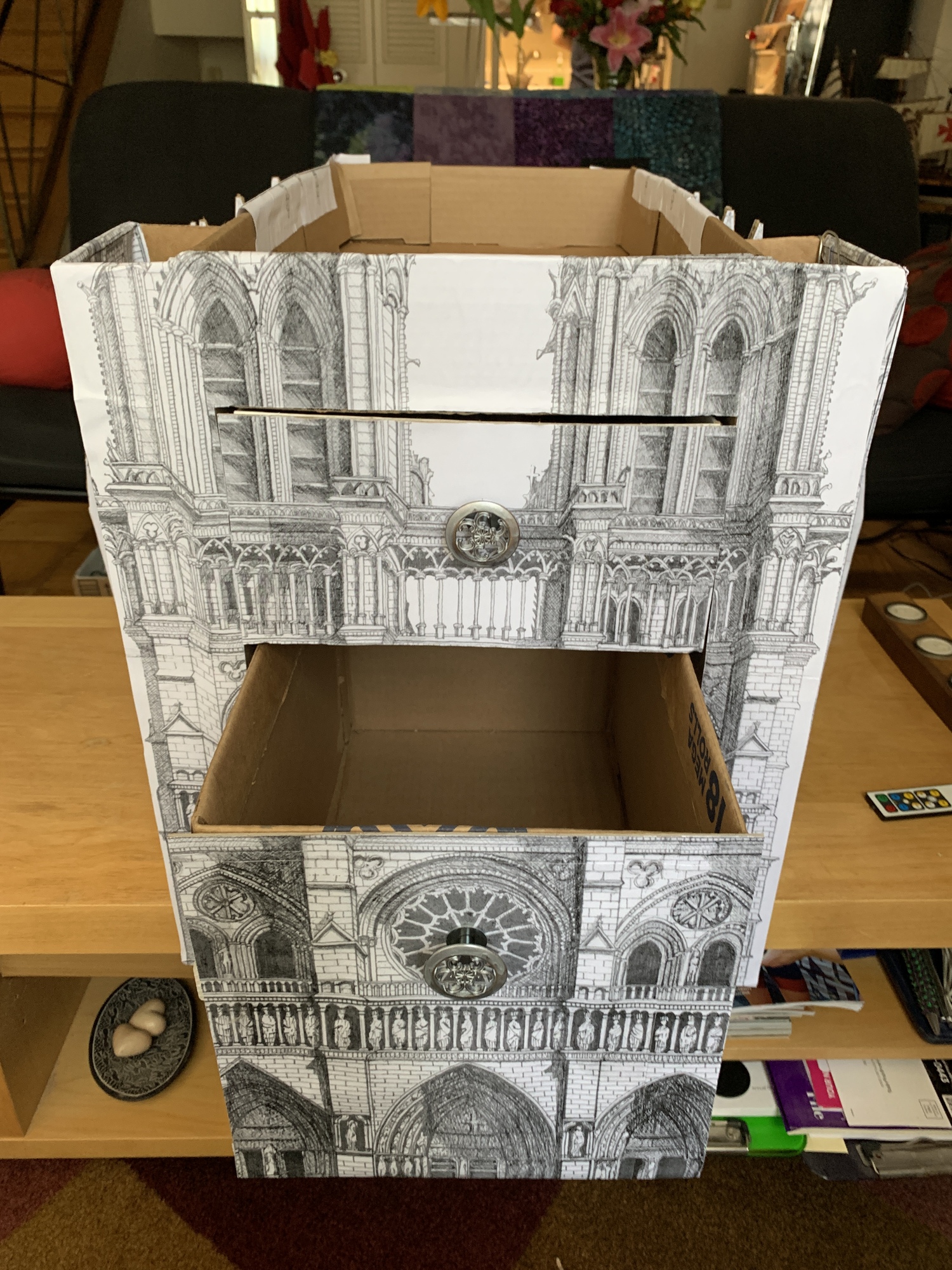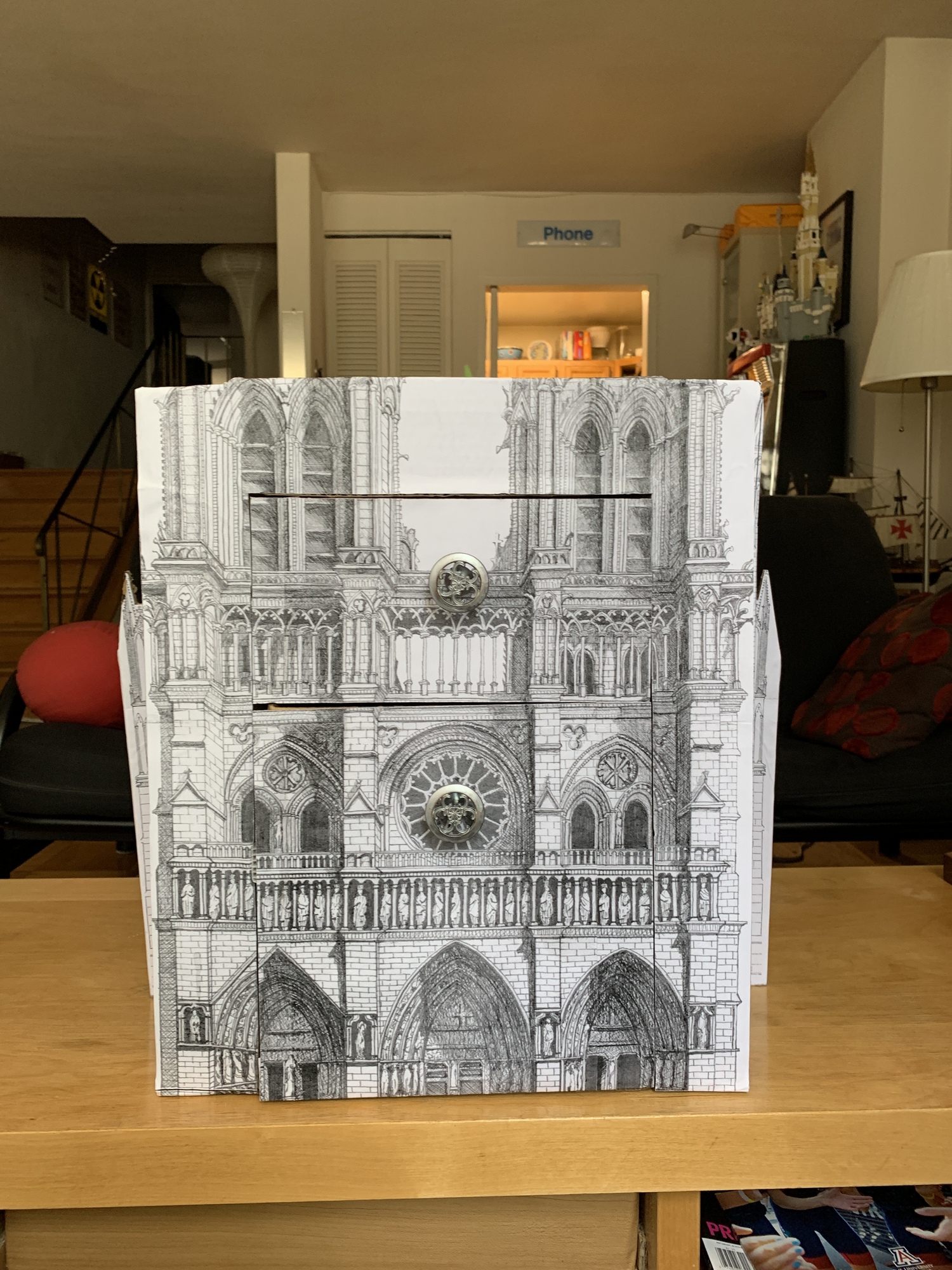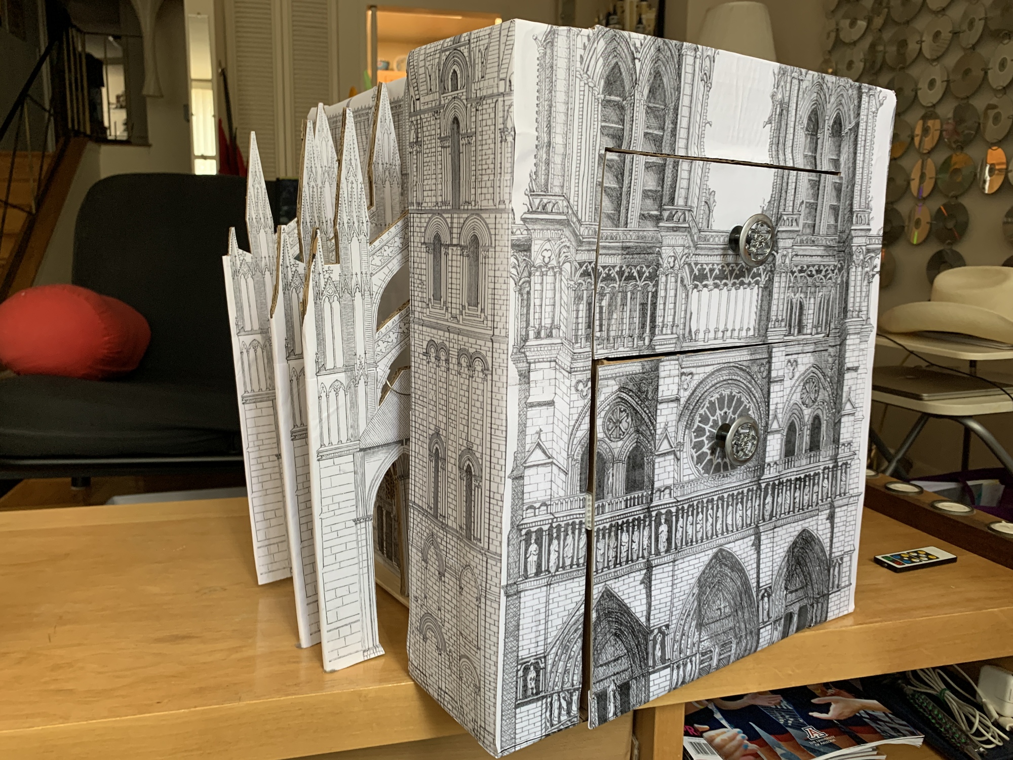 We had an old Quilted Northern box that could be the storage foundation. I found some high quality drawings of cathedrals online and mapped out the designs on the box.
