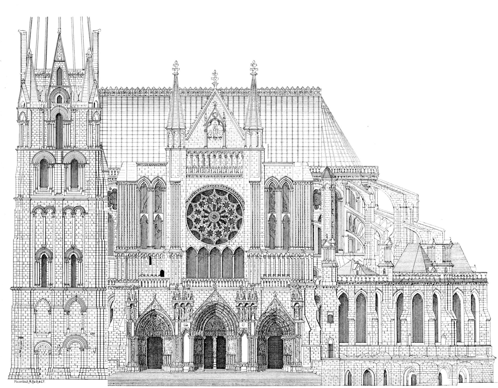 The front was inspired by Notre Dame because of its boxy shape. The side is a portion of the Cathedrale de Chartres because Wikipedia had a great illustration I could use. I printed everything on legal paper like I did for the Barbie house.